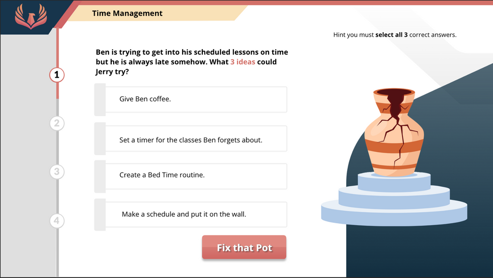 To keep the learners engaged there are several click-to-reveal interactions, a drag-and-drop interaction, and scenario-based interactions to help the learner practice creating a learning agreement. Sound effects are used throughout the training to encourage learners to try again or celebrate correct answers. To accompany the training there is a downloadable blank learning agreement that can be filled in by each family.
